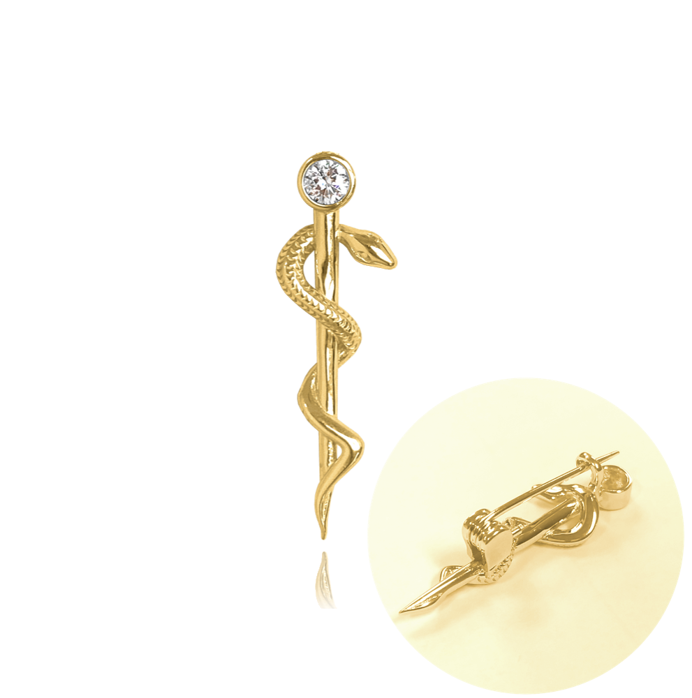 MINET Pozlacená stříbrná brož Aeskulapova hůl s bílým zirkonem